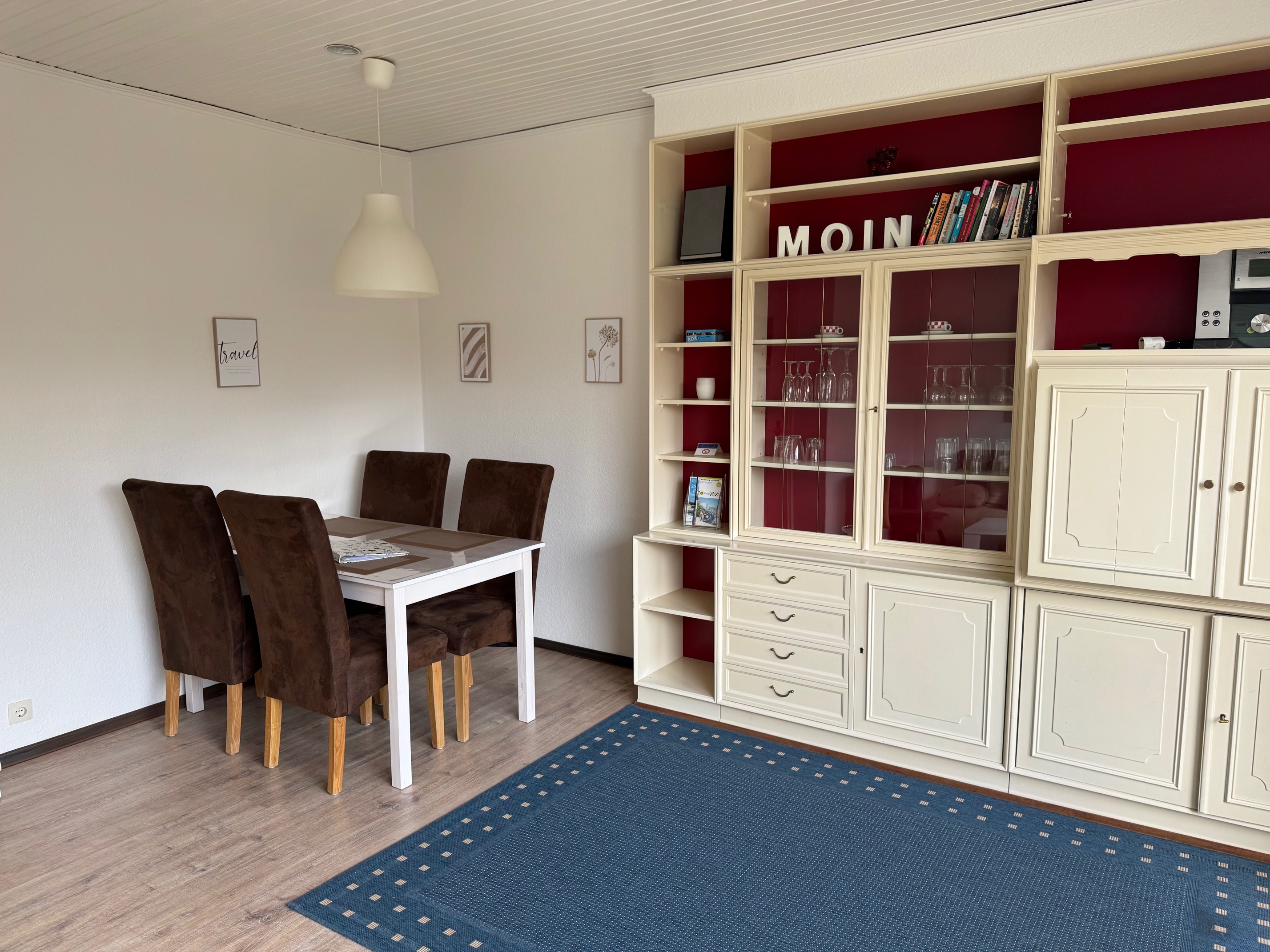 Der Esstisch mit 4 Stühlen und 2 Klappstühlen. Die Schrankwand mit Fernseher (SAT- TV mit Radio)Zugang zur Terrasse. Auf Wunsch stellen wir im Wohnzimmer zusätzlich zurDoppelschlafcouch ein Gästebett (ohne Berechnung) zur Verfügung um ein getrenntes
