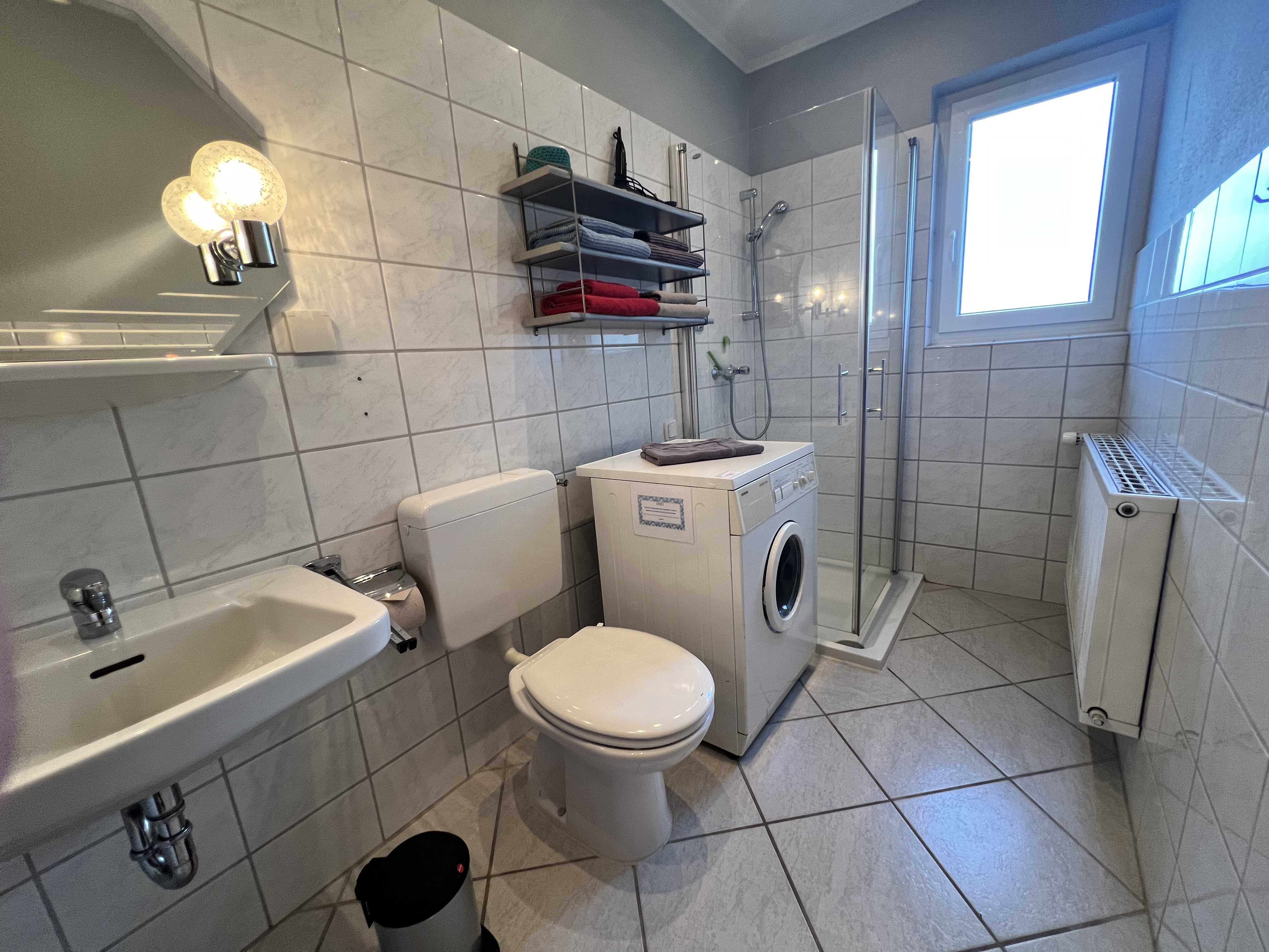 Dusche, Waschtisch, WC, Föhn, Handtücher (je 1x Badetuch und 1x Handtuch pro Person). Waschmaschine (Benutzung nach Vereinbarung)