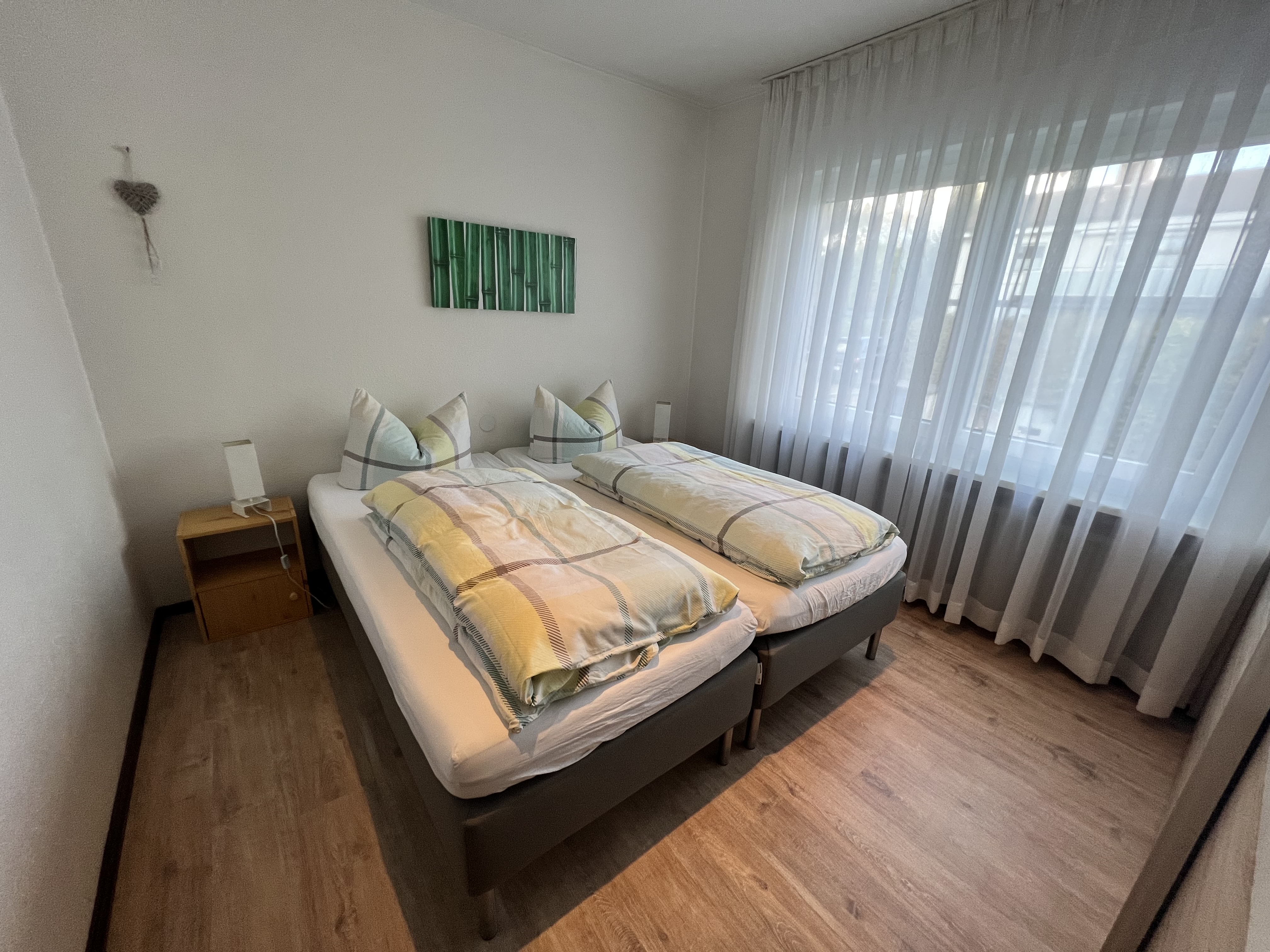 2 Einzelbetten (0,90x2,00 m) mit Bettwäsche, 2 kleinen Nachttischen und Leselampen und einem Kleiderschrank.