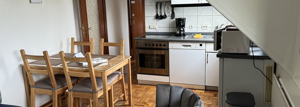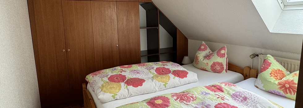 Im Dachgeschoss unseres Einfamilienhauses befindet sich diese ansprechend eingerichtete 2-Zimmer Ferienwohnung (ca. 32 m²) mit Balkon. Das Wohnzimmer ist mit einer 2-er Schlafcouch und mit einer modernen Küchenzeile ausgestattet. Im Schlafzimmer befinden sich zwei Einzelbetten (0,90x2,00 m) die sich ohne weiteres zusammenschieben lassen.