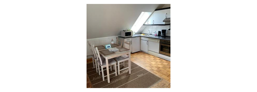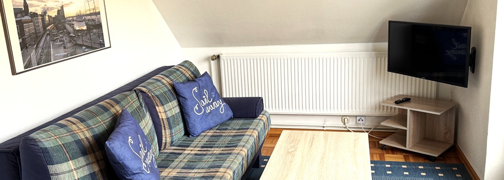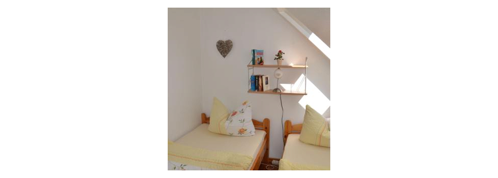Im Dachgeschoss befindet sich diese ansprechend eingerichtete 2-Zimmer Ferienwohnung (ca. 36 m²) mit Balkon. Das Wohnzimmer ist mit einer 2-er Schlafcouch und mit einer modernen Küchenzeile ausgestattet. Im Schlafzimmer befinden sich zwei Einzelbetten (0,90x2,00 m).